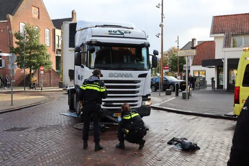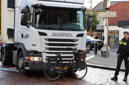 tussen een vrachtwagen en een fietsster op de kruising Raadhuisplein en