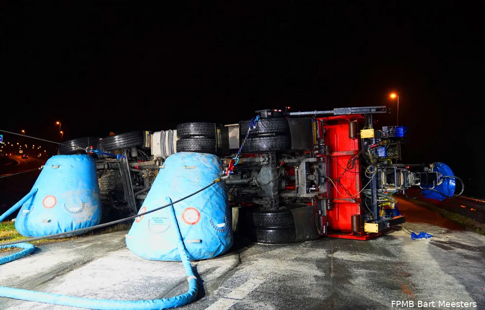 Hulpdiensten en wegbeheerders kwamen in de nacht ter plaatse om de situatie veilig te stellen. De chauffeur is met een ambulance ter controle naar het ziekenhuis gebracht. De vrachtwagen is inmiddels weer rechtgezet, maar moet nog worden geborgen.