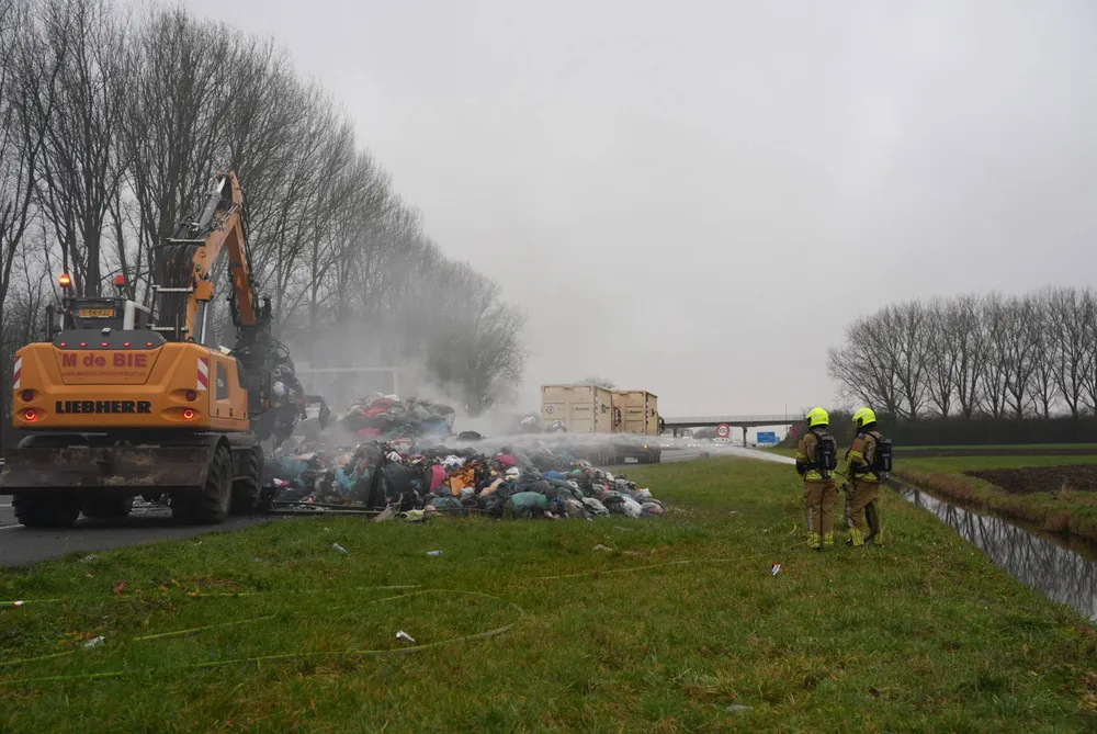 Op de A59 bij Waalwijk is woensdagochtend een vrachtwagen in brand gevlogen die balen textiel vervoerde. Het verkeer richting Hooipolder heeft daar veel hinder van want door de brand kan het verkeer niet meer over de A59.