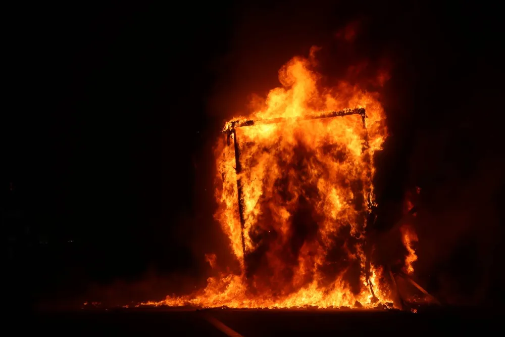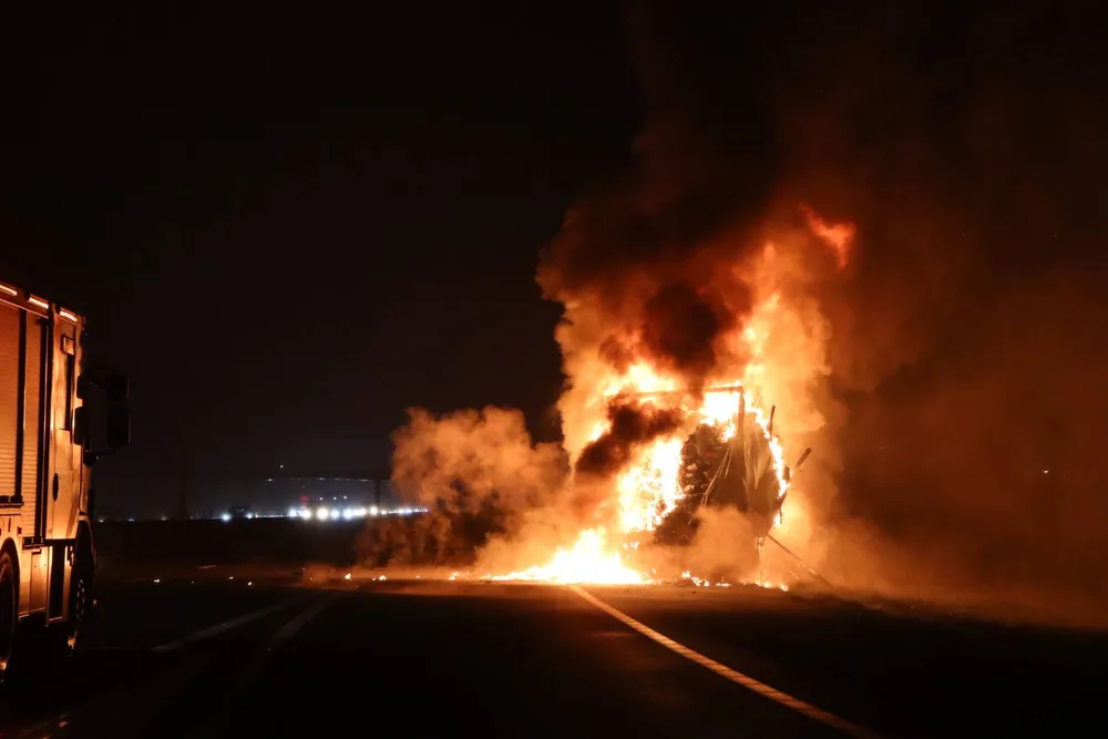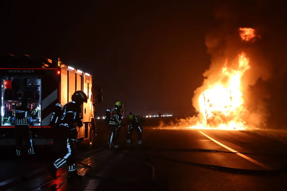 De politie beboet automobilisten die de brand filmen. In de andere richting gebeurde ook een ongeluk, mogelijk door telefoongebruik’, deelt de politie. De plaats van de brand is afgeschermd.