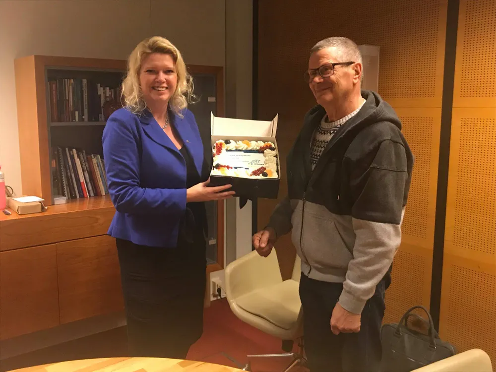 Wethouder Thom Blankers mocht de taart overhandigen aan Talal Saadi. Talal zet zich in als tolk en vrijwilliger bij stichting vluchtelingenwerk. Dankzij zijn hulp kunnen vluchtelingen in Heusden meedoen! Met zijn hulp komen deze vluchtelingen zelfs aan een baan waardoor ze sneller integreren in de Heusdense samenleving.