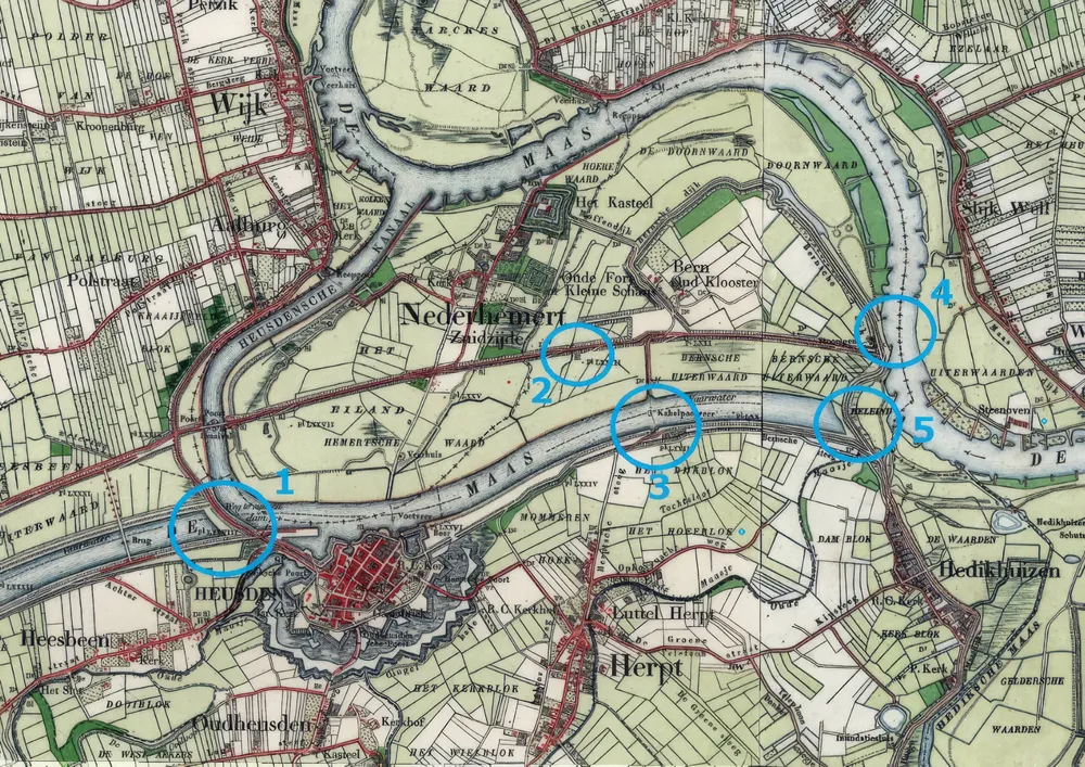 afsluitende dijk bij Heesbeen, 2. Sluisduiker voor de polder Het Eiland Nederhemert, 3. Veer