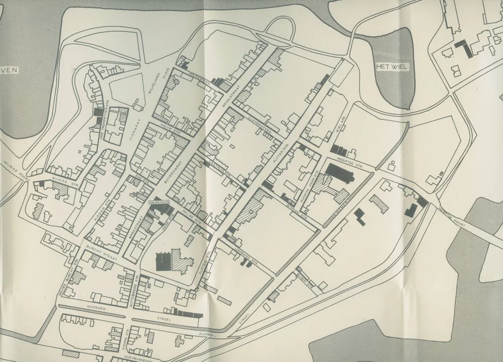 Foto Links: Plattegrond van de stad Heusden waarop in het zwart de verwoeste panden zijn aangegeven. Bron SALHA
