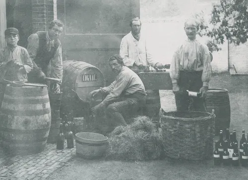 Bottelen van flessen cognac bij de wijnhandel van Kees jr. Malingré, ~1880.