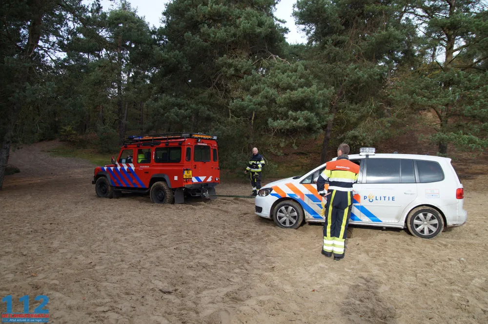 Een politiewagen die ook op weg was naar het ongeval reed zichzelf muurvast in het zand. De Jeep van de brandweer moest ook hier aan te pas komen om de auto los te trekken.