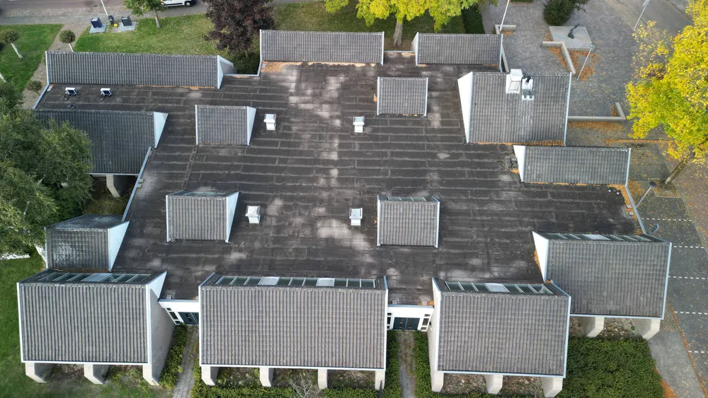 repeterend kleine zadeldaken met eenzelfde nokrichting. Droneopname Jan