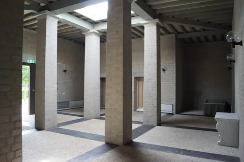 door de sobere vormgeving van de gebouwen en grijpt terug op vroegchristelijke