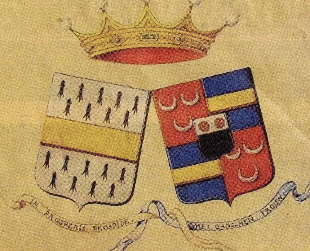 Foto Midden: Het wapenschild van het echtpaar De la Court en Half-Wassenaer. De wapenspreuk is links IN PROSPERI PROSPICE -KIJK NAAR HET VERLEDEN EN DE TOEKOMST en rechts MET GANSCHEN TROUW. Bron Wikipedia