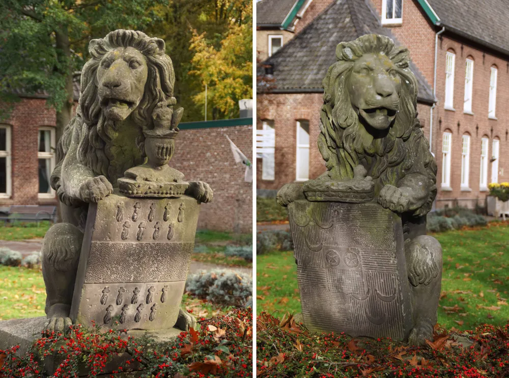 Foto Rechts: Links, de leeuw met het wapenschild van familie De la Court. Rechts, de leeuw met het wapenschild van familie Half-Wassenaer. Het bovenstuk op het wapenschild met helm, wrong en helmteken is hier afgebroken. Foto Ad Pellemans