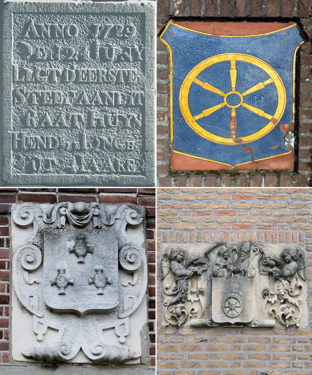 Foto Links: Collage van afbeeldingen van de gevelstenen van de voormalige