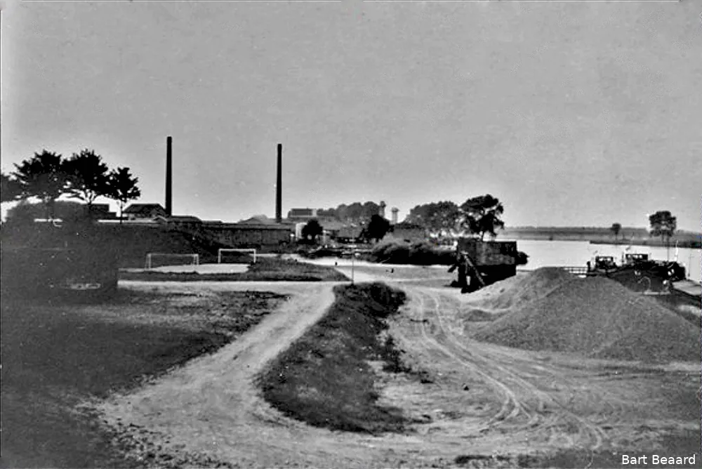 melkfabriek en conservenfabriek. Rechts ook de aanlegsteiger t.b.v. de zand- en