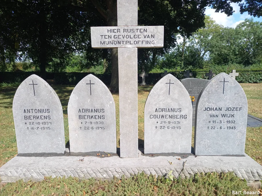 Op de Algemene Begraafplaats Buytenhove aan de Herptseweg in Heusden bevindt zich op het oude gedeelte, de vroegere RK-begraafplaats, een grafmonument met vier aparte grafstenen en een kruis in het midden. Op dat kruis staat de tekst: ‘HIER RUSTEN TEN GEVOLGE VAN MIJNONTPLOFFING’. De namen op de grafstenen zijn v.l.n.r. Antonius Bierkens, Adrianus Bierkens, Adrianus Couwenberg en Johan Jozef van Wijk. Ook zij maakten deel uit van de trieste en donkere oorlogsgeschiedenis van de stad Heusden. Met dit ongeval kwam het totaal aantal oorlogsslachtoffers op 160. In mijn boek ‘Heusden in oorlogstijd’ staat in hoofdstuk 59 een gedetailleerd overzicht.