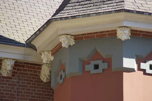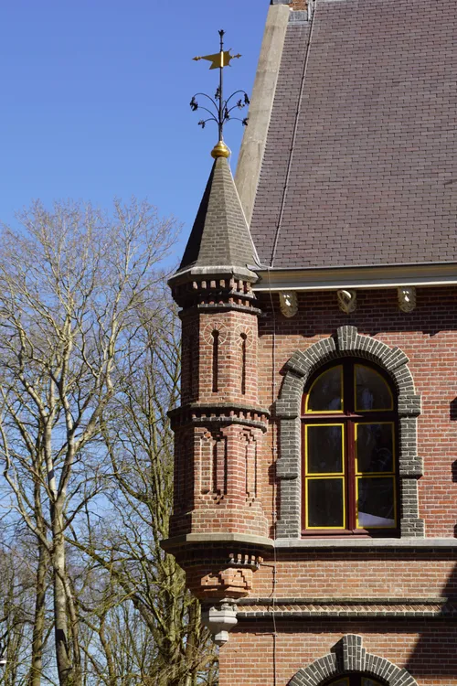 3. middengevel – entree Het middengedeelte bestaat uit twee achtkanten ingesnoerde torens met een tussengedeelte. De vorm doet denken aan een poortgebouw. Het geheel is in een roodbruine kleur gekaleid. Bij kaleien wordt met een blokkwast een kalkpleister in kleur aangebracht, waarbij de structuur van de bakstenen muur zichtbaar blijft. Alle uitspringende en versierende ornamenten zijn gepleisterd en in natuursteen kleur geschilderd. Op het tweelaagse tussengedeelte rust een trapgevel. De trapgevel en de verdieping van het tussengedeelte zijn zichtbaar gemetseld in kruisverband. De begane grond is gepleisterd.