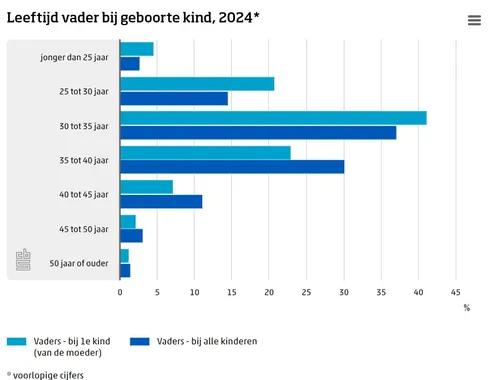 Nieuwe vaders zijn vooral dertigers Van de 77 duizend mannen die in 2024 voor het eerst vader werden was bijna twee derde tussen de 30 en 40 jaar oud. Een kwart was jonger dan 30 jaar.