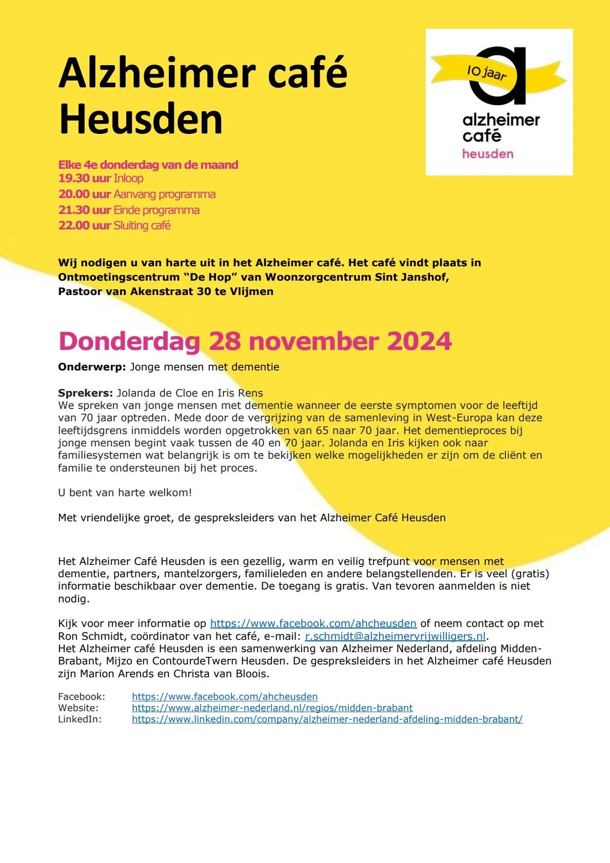Het Alzheimer Café Heusden is een samenwerking van Alzheimer Nederland, afdeling Midden- Brabant, Mijzo en ContourdeTwern Heusden. De gespreksleiders in het Alzheimer Café Heusden