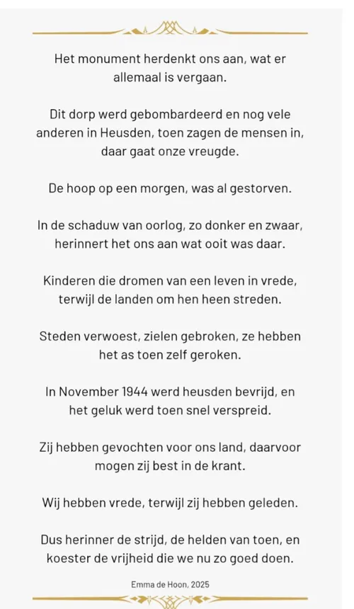 Tijdens de herdenking werd het bekende gedicht van Cees Akerboom voorgedragen. Daarnaast zorgde Emma de Hoorn, leerling uit groep 8, voor een bijzonder moment door haar zelfgeschreven gedicht voor te dragen. Haar persoonlijke woorden raakten zichtbaar het aanwezige publiek.