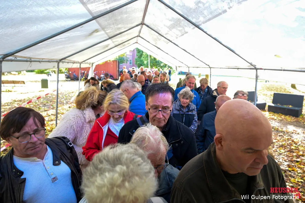 Even voor 14.00 uur stond buiten nog een korte rij, maar binnen vijf minuten was de hele tent gevuld. Bezoekers liepen met stapels boeken, trolleys en de handige jutetassen (die men kreeg als men niets bij zich had) richting de kassa. En alsof het zo moest zijn: op dat moment brak ook buiten de zon door.