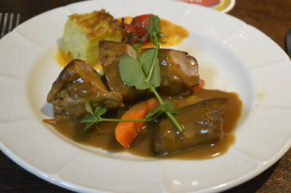 De mensen konden genieten van een heerlijke maaltijd, met keuze uit een tomaten- en mosterdsoep en twee hoofdgerechten t.w. varkenshaas of schnitzel met champignon- of pepersaus. Salade en frietjes werden er op alle tafels neergezet en de frietjes werden nog eens extra aangevuld. De drankjes naar keuze stonden ook klaar in overvloed. Het nagerecht – een crumble appeltaart met vanille ijs en slagroom – viel bij iedereen bijzonder goed in de smaak en was een mooie afsluiting.