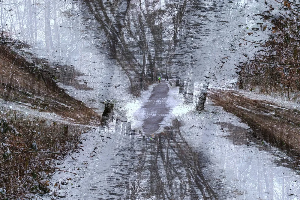 De fietssporen in de sneeuw vloeien mooi samen met de bomen langs het pad, waardoor ze zelf op boomstammen lijken. Een leuke bijkomstigheid was de hardloper in een felgroen trainingsjack die op dat moment kwam aanrennen; dat gaf de foto precies het accent dat hem voor mij afmaakt. Double exposure heeft sindsdien mijn hart gestolen; ik ga hier zeker vaker mee experimenteren.