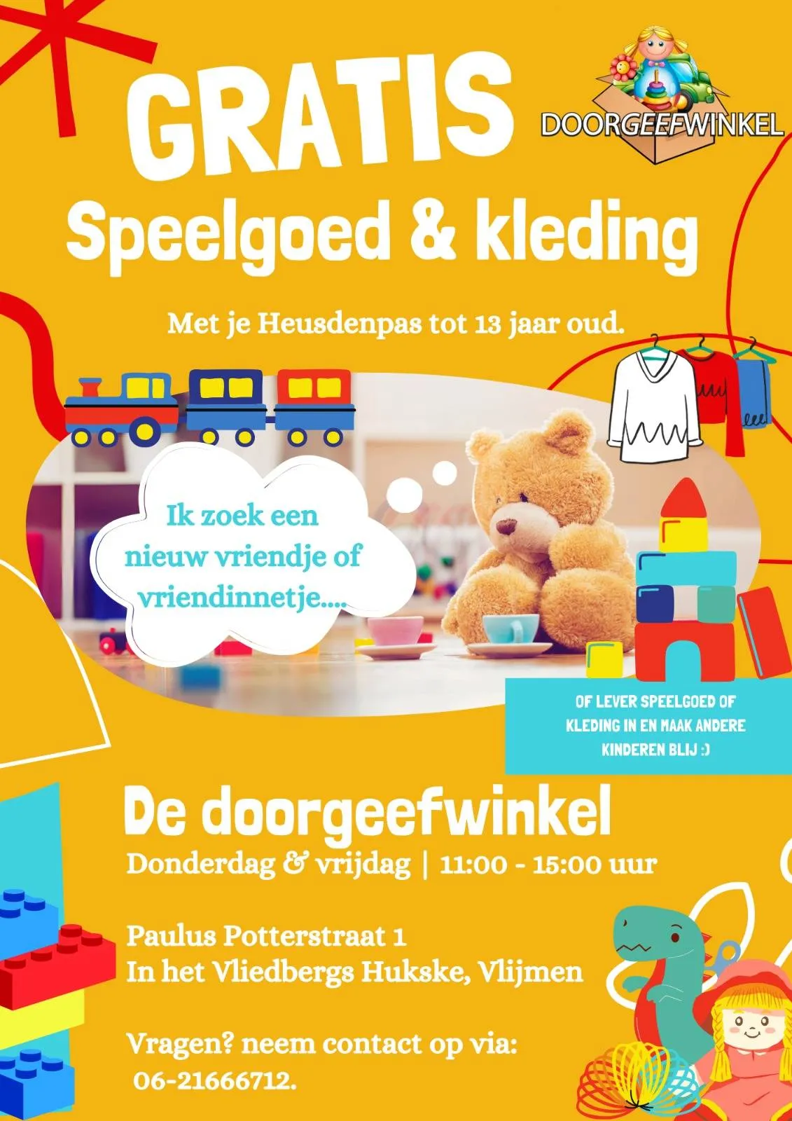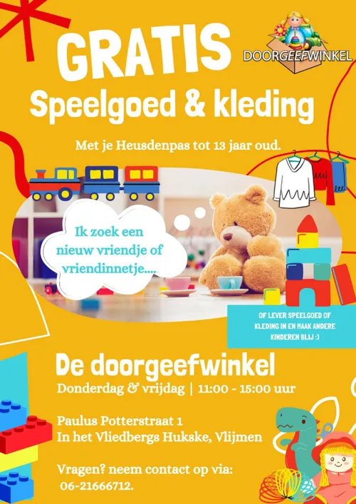 Francien en Miranda runnen sinds kort een Doorgeefwinkel op de Vliedberg in Vlijmen. In deze vrolijke winkel kunnen ouders met een HeusdenPas, samen met hun kind, gratis speelgoed uit komen zoeken. Er is speelgoed voor kinderen van 0 tot en met 12 jaar. De doorgeefwinkel biedt daarnaast ook kleding aan voor kinderen tot en met 13 jaar.