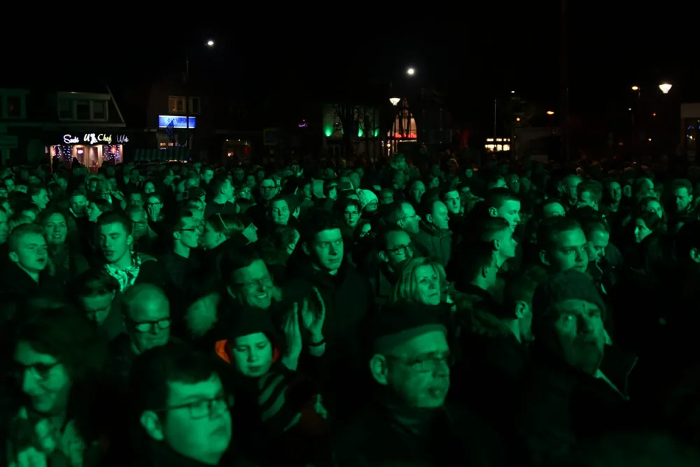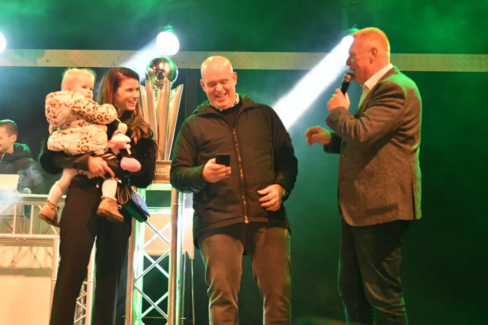 Darter Michael van Gerwen is donderdagavond in zijn woonplaats Vlijmen gehuldigd vanwege zijn derde wereldtitel. De wereldkampioen werd vanaf 19.00 uur toegejuicht op het volle Plein.