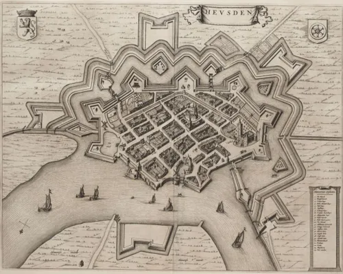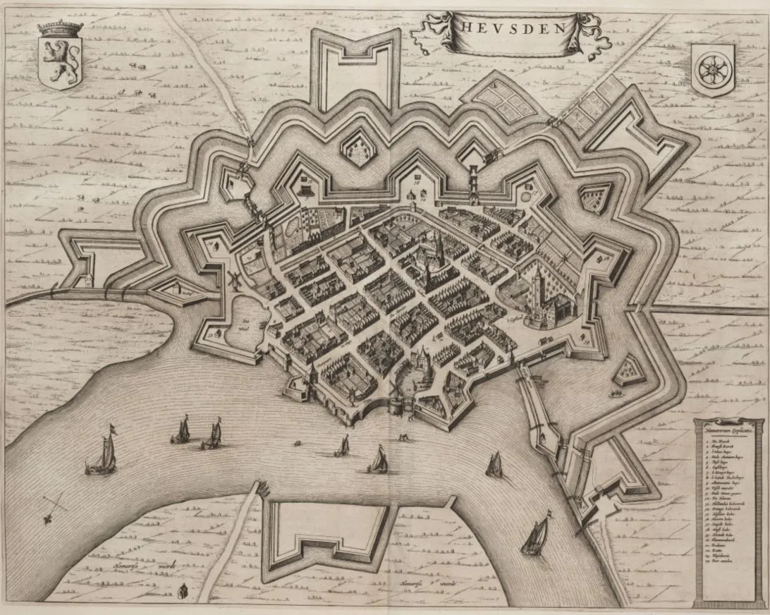 Deze stadskaart van Heusden, gebaseerd op metingen, biedt een verrassend realistische kijk op de historische stad. Maar bij nadere bestudering valt op dat de graveur destijds het stratenplan rationeler heeft weergegeven dan het in werkelijkheid was: met gelijkvormige bouwblokken en haaks op elkaar staande straten, alsof de stad speciaal voor de kaart is ontworpen. En dat is ook zo. Deze stadskaarten waren voor de stadsbestuurders een middel om te laten zien hoe mooi, rijk, voornaam en ook nog hoe militair voorbereid hun stad was.De vestingwerken van Heusden, die aan het begin van de 17e eeuw aan de zuidzijde van de stad zijn gegraven en opgeworpen, hebben onder meer negen bastions, vijf ravelijnen en vijf hoornwerken.