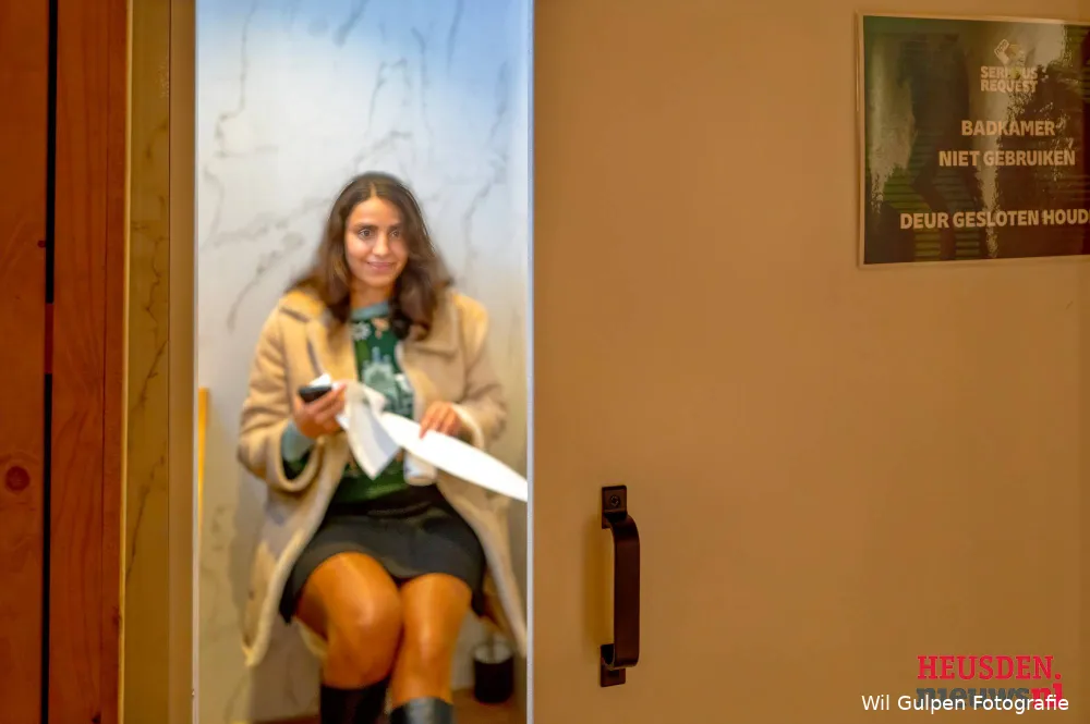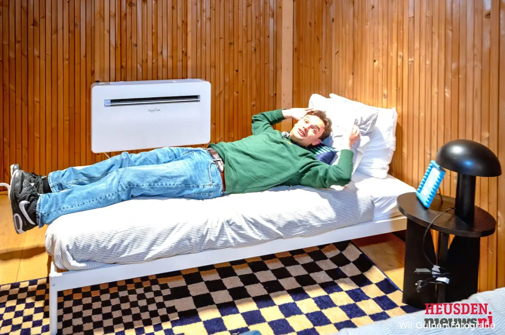 Het slaapvertrek voor Mart en Barend is voorzien van twee goede bedden, zoals Mart even had getest, en een airco. Mart maakte gekscherend de opmerking dat wie het kortste bij de airco ligt, waarschijnlijk aan het einde van de week geen stem meer zal hebben. Dus maar afwachten of het Barend of Mart zal zijn. Eén ding zal een vraag blijven: of de dj’s wel mogen douchen, want op het bordje naar de toilet-/doucheruimte staat een tekst die tot nadenken prikkelt. Samira van Den Bosch City was bereid om op de achtergrond even als model te functioneren op het toilet. De sfeer onder de aanwezige pers was net zo gemoedelijk als de hele rondleiding. Ook al keek Mart een beetje beteuterd dat hij niet naar buiten kon, ook al was het maar voor de foto. Morgen om 16.30 uur zal het de werkelijkheid zijn.