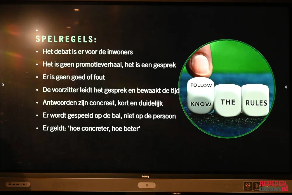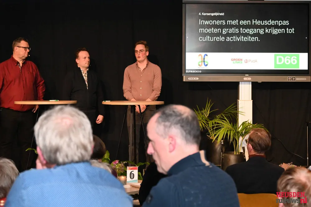 Aan het debat namens de Heusdense politieke partijen namen deel Erik van de Bek (D66 Heusden), Martijn van Esch (DMP), Rob Klerks en Erika van Gessel (Heusden één), Rick Timmermans (GroenLinks/PvdA Heusden), Bram Lommers (VVD Heusden), Charlotte Bol (CDA Heusden), Jeroen van den Bosch (Gemeentebelangen) en Jan Kleian (Heusden Transparant Verbindt).