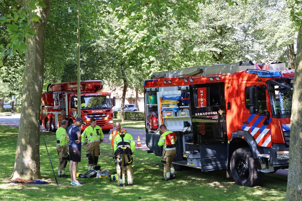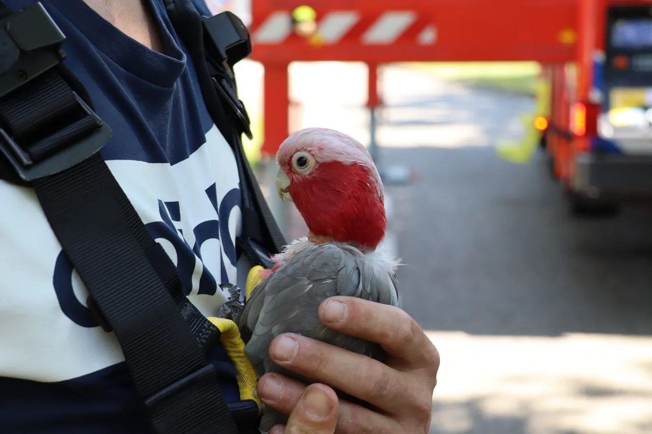 Na twee dagen zoeken dook de rode kaketoe Rody op in een boom aan de Statenlaan in Drunen. Een hoogwerker van de brandweer was nodig om de kaketoe uit de boom te halen.