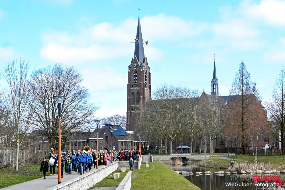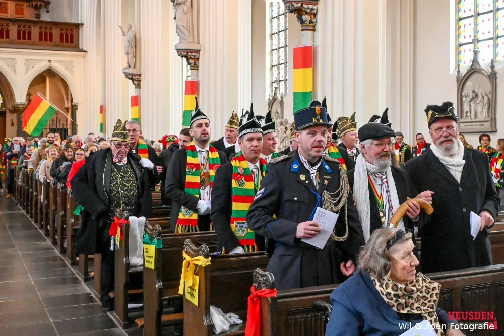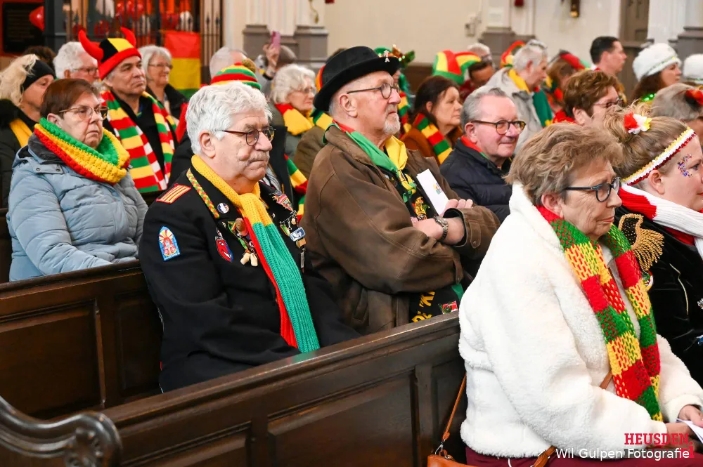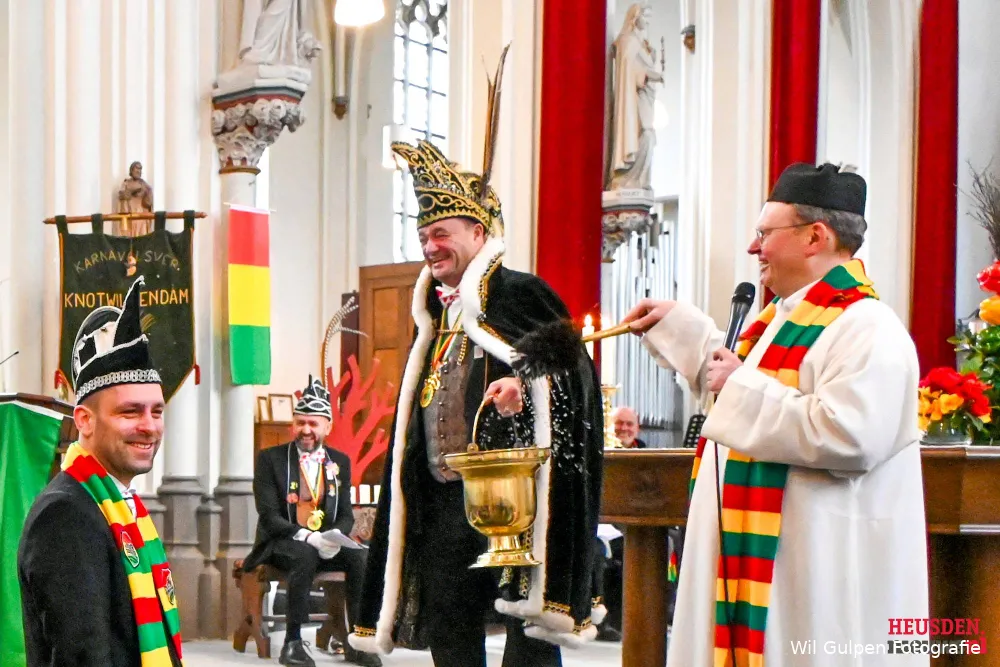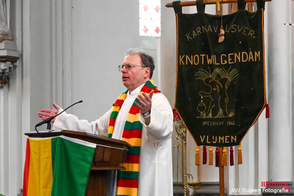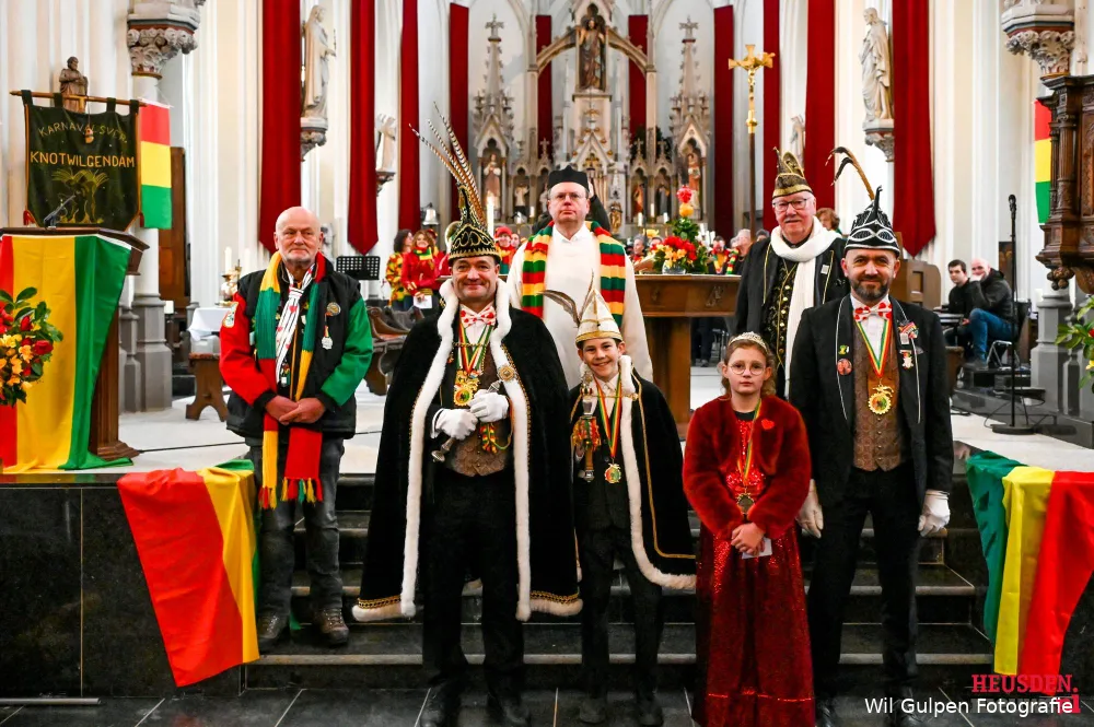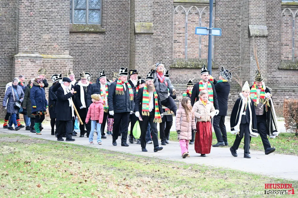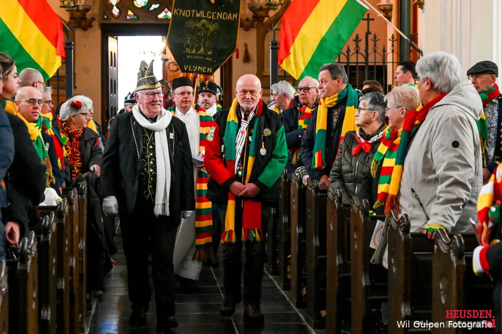 Na de eerste gezelligheid trok het gezelschap gezamenlijk naar het oude gemeentehuis, waar traditiegetrouw de statiefoto werd gemaakt. Een vast moment, met een vaste plek — maar elk jaar weer net even anders. Daarna ging het onder begeleiding van dweilorkest De Halve Zolen richting de kerk. Pastoor Lebrun stond hen daar al op te wachten om samen met een goedgevulde kerk Knillis binnen te halen.