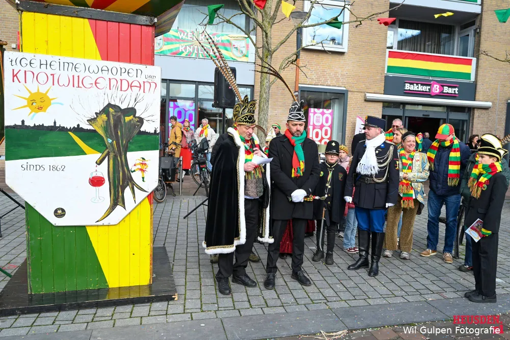 Na de afsluiting van de mis door pastoor Lebrun trok het gezelschap opnieuw onder begeleiding van De Halve Zolen richting het Plein, waar de onthulling van Knillis plaatsvond. Na enkele mooie woorden van Prins Jorg werd duidelijk dat ook Knillis de komende dagen “op z’n kop” zou gaan.