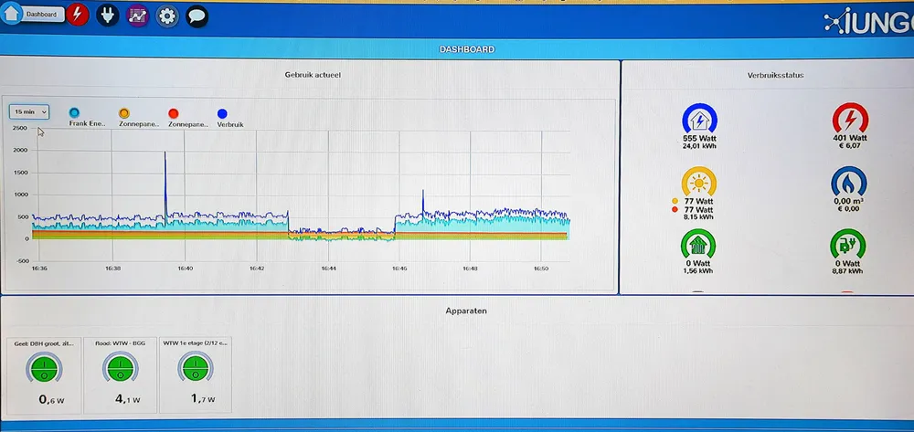 In 2025 is een thuisbatterij aangeschaft (Sig Energy) 24 kWh met noodstroomvoorziening. Tussen alle bedrijven door is de meterkast gemoderniseerd en uitgebreid en een oplaadaansluiting aangelegd voor de hybride en elektrische auto.”