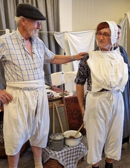 Ondertussen genoten de gasten van een koffie/thee met een stroopwafel en in de pauze nog een drankje naar keuze. Marie ging door met een uitleg van wat er aan de waslijn hing. Een waslijn zonder de tegenwoordige wasknijpers, maar twee in elkaar gedraaide touwen, waar de punten van de was simpelweg tussen geduwd werden.