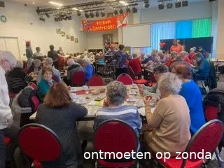 "We zijn drie jaar verder en het is nog steeds een succes. Zo’n 60 tot 80 mensen bezoeken zo’n zondag in De Mand. Na binnenkomst (vanaf 11.00 uur) staat de koffie/thee met iets lekkers klaar (met koningsdag een oranje tompouce). Na het openingswoord een rondje bingo. Dan is het tijd voor de lunch, meestal soep met broodjes, maar er is ook genoten van een broodje kroket, een broodje hamburger, een slaatje, pannenkoeken (gesponsord door de Efteling). En dan ’s middags muziek of een andere activiteit (pubkwis), waarbij altijd iets lekkers geserveerd wordt (snacks, oliebollen tijdens de Vlijmense kermis, een ijsje). En niet te vergeten de loterij. Tussendoor wordt er gekletst, gekaart, spelletjes gedaan, gebreid, gehaakt, geknutseld. Wat een gezelligheid.