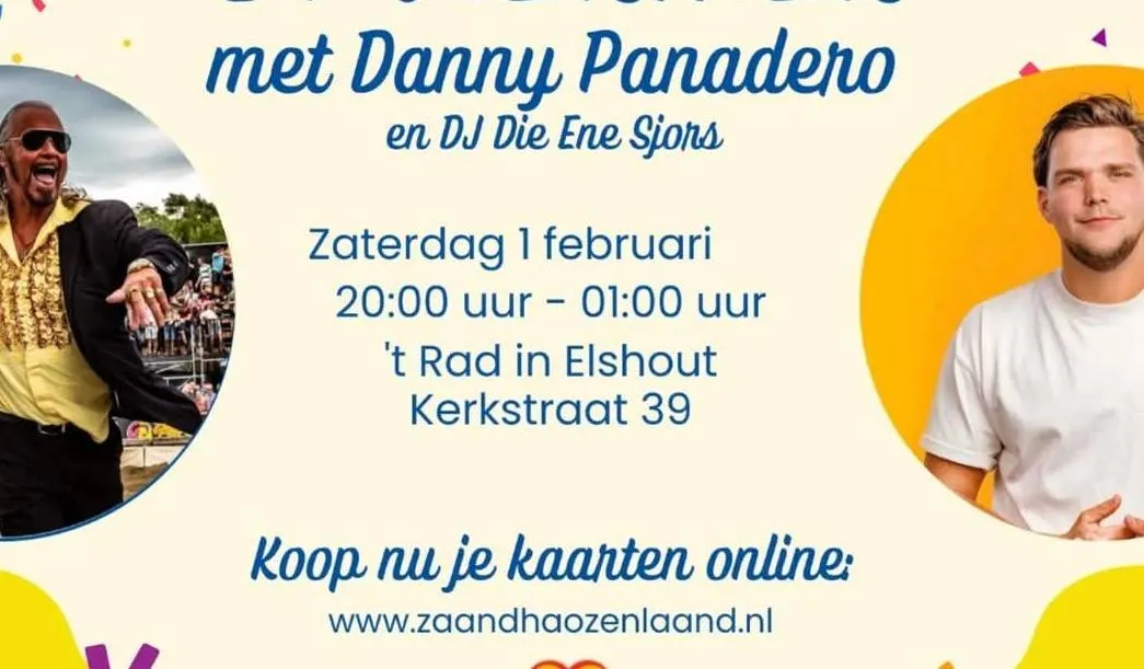 Deze avond belooft een spektakel te worden met Danny Panadero als hoofdact en DJ Die Ene Sjors.