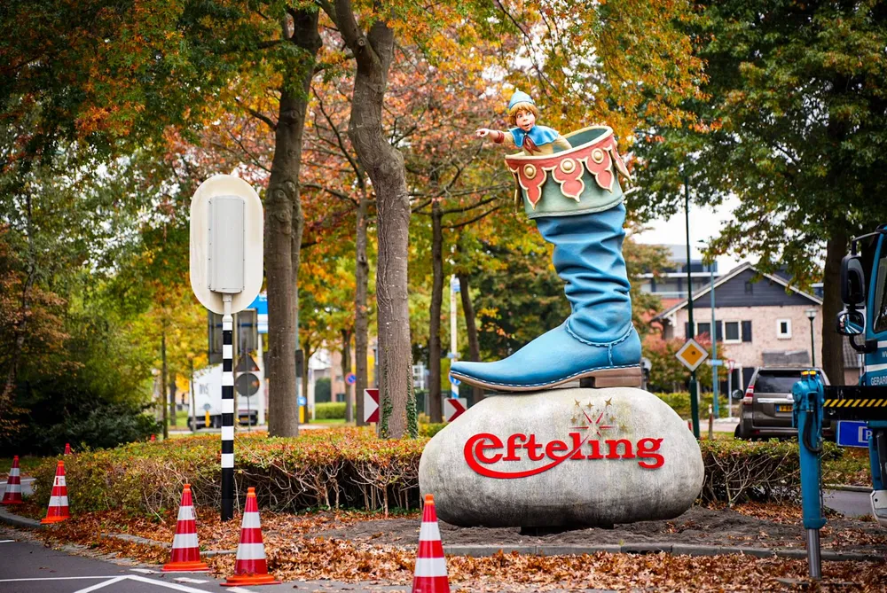 Boven de weg aan de Europalaan in Kaatsheuvel hingen al matrixborden om het verkeer richting De Efteling te leiden, maar voortaan wijst ook Klein Duimpje de weg. Gerard Lammers B.V uit Nieuwkuijk hielp mee met het plaatsen van een nieuw en opvallend herkenningspunt. Op deze plek prijkt nu een reusachtige laars met bovenop het sprookjesfiguurtje Klein Duimpje.