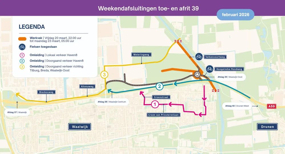 Weekendafsluiting 20 maart tot 23 maart Van vrijdag 20 maart 22.00 uur tot maandag 23 maart 05.00 uur zijn de toe- en afrit 39 van de A59 dicht: < Toerit 39 vanuit Waalwijk naar de A59 richting Breda < Afrit 39 vanuit ‘s-Hertogenbosch naar Waalwijk < Afrit 39 op A59 vanuit Breda naar Waalwijk blijft open.
