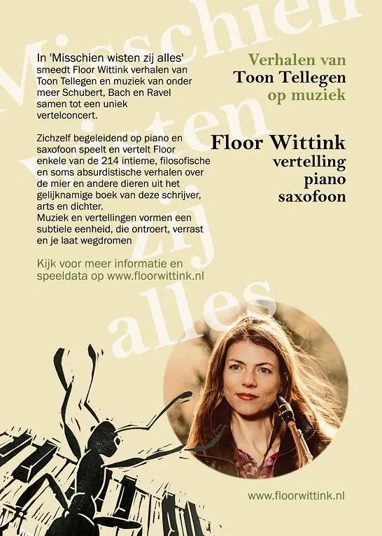 In “Misschien wisten zij alles” smeedt Floor Wittink verhalen van Toon Tellegen en muziek van onder meer Schubert, Bach en Ravel samen tot een uniek vertelconcert voor volwassenen.