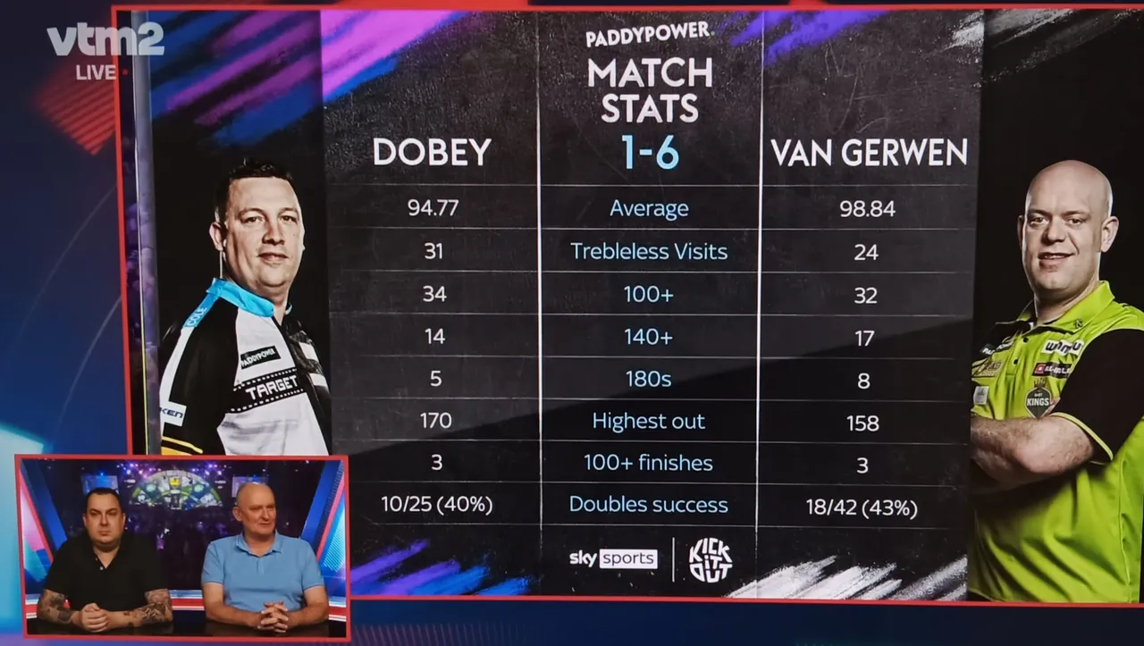Na een snelle 2-0 voorsprong in sets, deed Dobey wat terug in set 3 en kwam terug tot 2-1. Maar MVG ging verder waar hij gebleven was. Hij had een ijzersterke 4e set en het verschil werd weer 2 legs. Hij gooide vier 180's en 53% op de dubbels.
