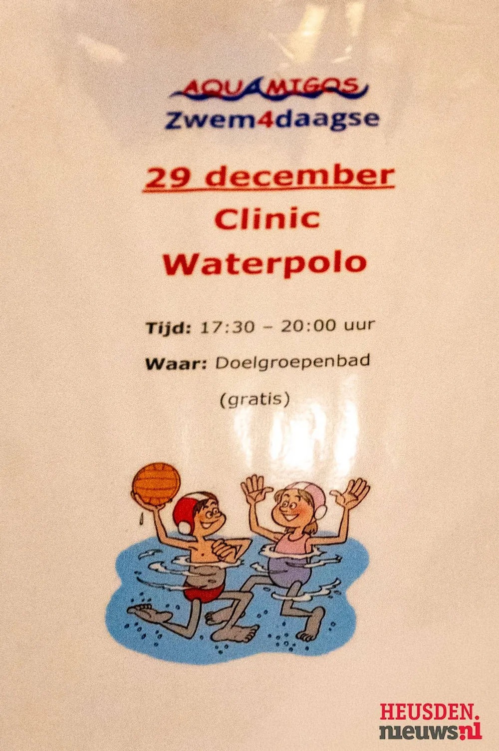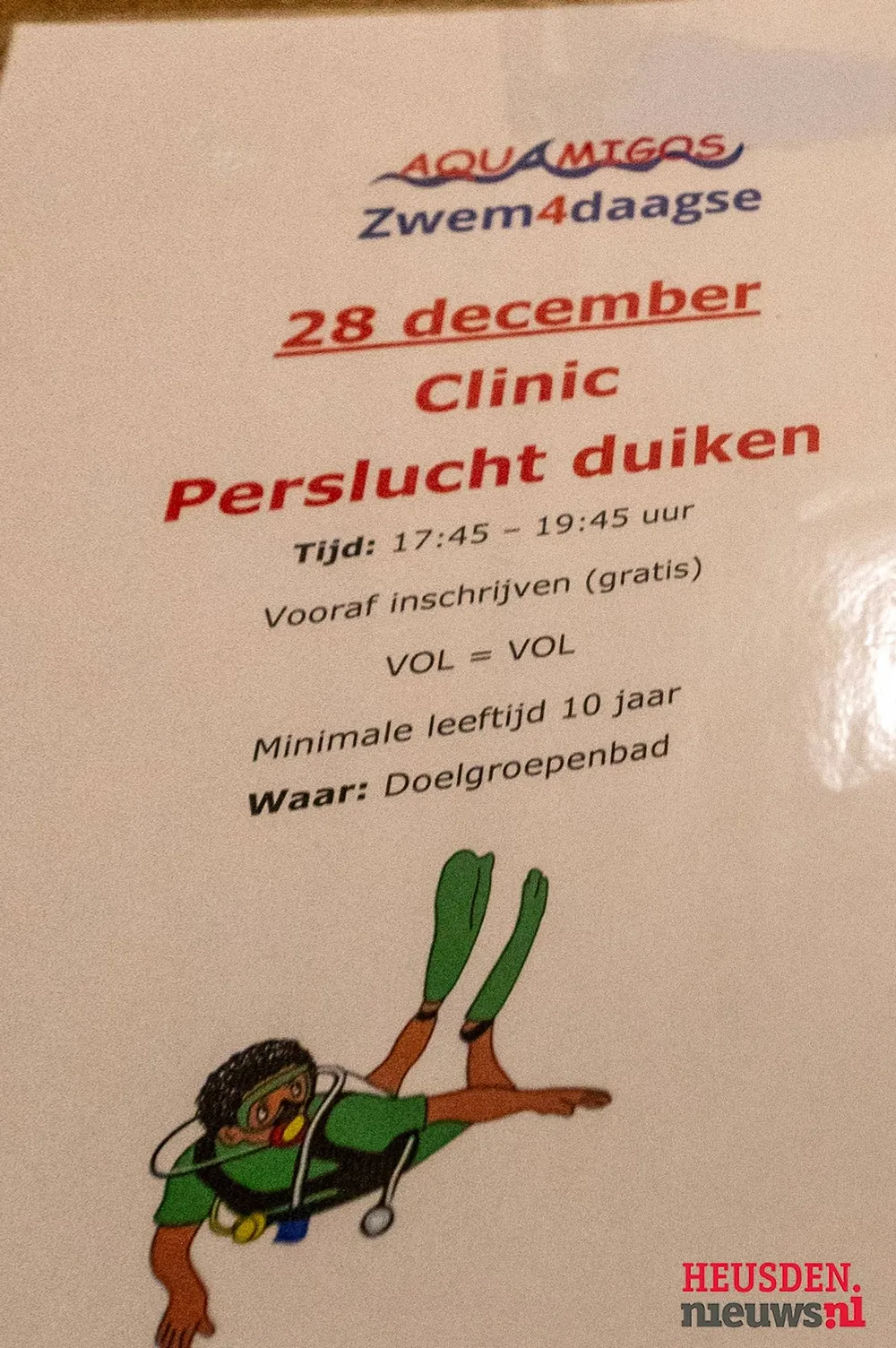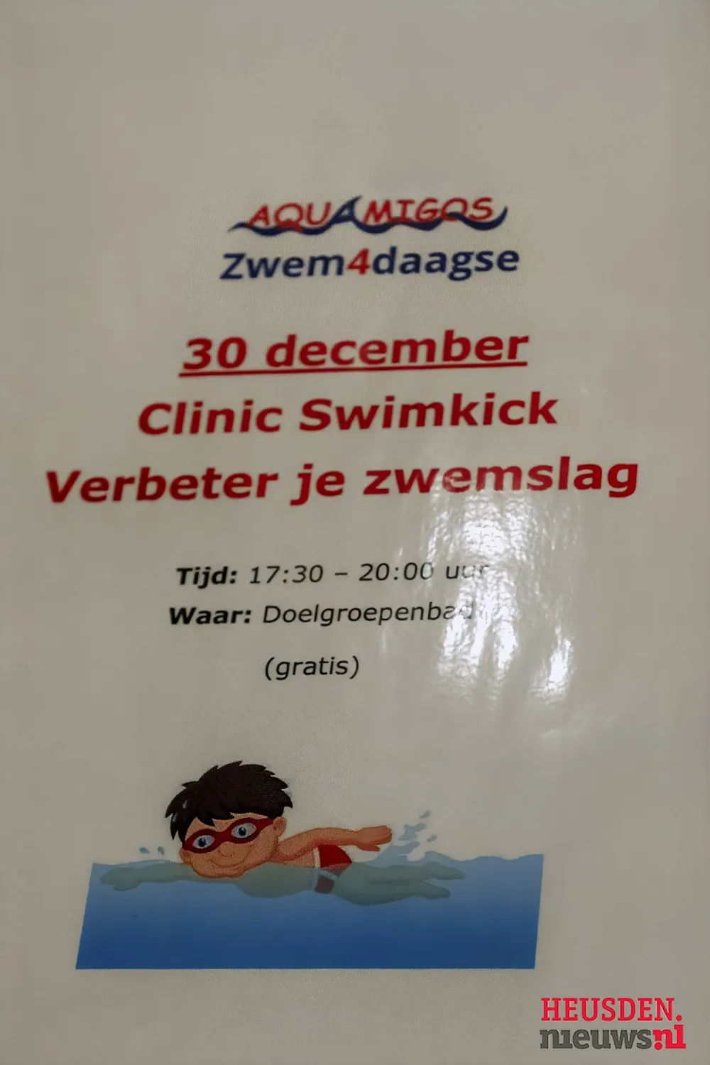 Zaterdag 27 december startte de Avond Zwem Vierdaagse weer in zwembad Die Heygrave te Vlijmen . De organisatie is in handen van AquAmigos. Vanaf 17:30 uur stroomden zwemmers al binnen, waardoor er op de eerste avond van de vier al meer dan 140 zwemmers van alle leeftijden actief waren.
