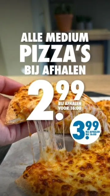 medium pizza's zijn voor 16.00 uur slechts €2,99 en na 16.00 uur €3,99. Zo laag